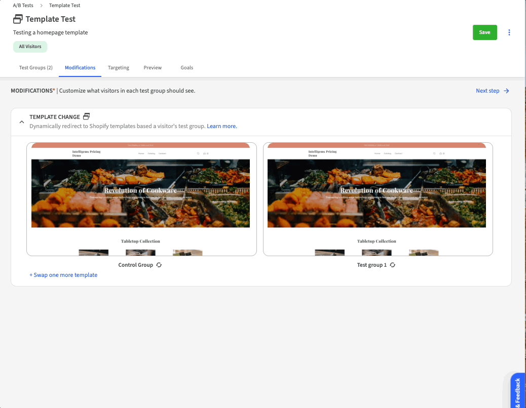 You can add new groups to include in the test by clicking on the ‘+’ button. Name the groups for the experiment and use the slider to allocate what percentage of traffic will go to each group. Click ‘Next Step’ when you are done.