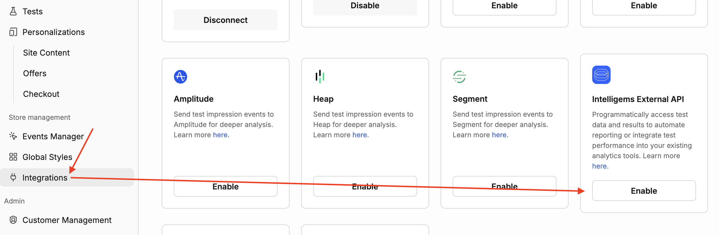 To generate your API key, in your Intelligems account, navigate to *Integrations* > Intelligems *External API* > Select *Enable*. A pop-up will appear with your API key. You can also navigate back here at any time to grab that same API key again.