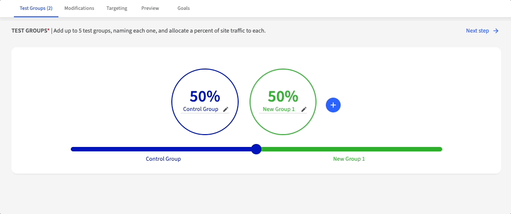 Create 2-5 groups by clicking +. Name each group and use the slider to allocate traffic percentage. Click Next step when ready.