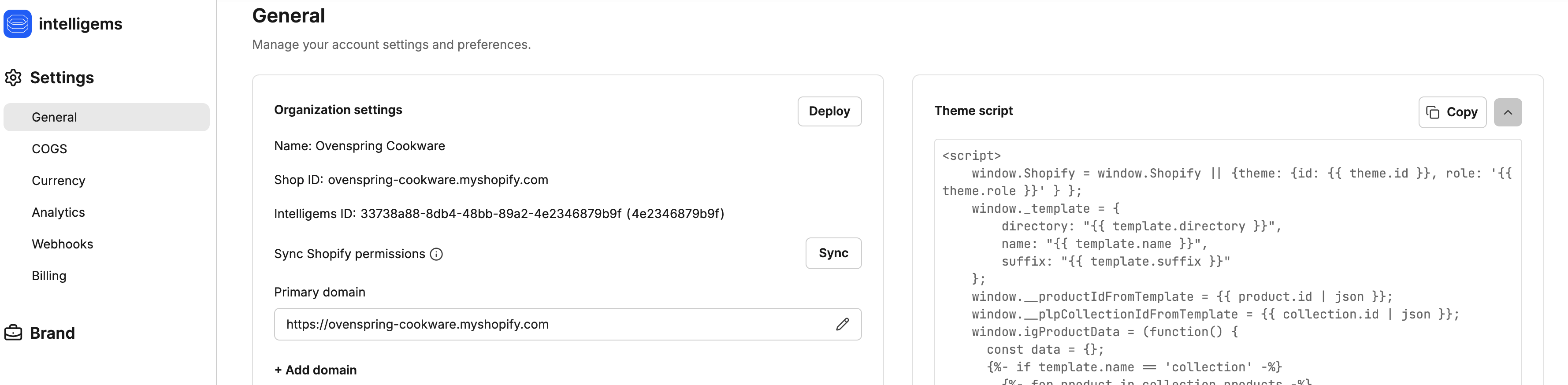 To complete this, go to the settings page in the Intelligems app. Once there, you'll see a section called "Theme Script". Click the blue button in that block that says "Copy Script". This will copy your unique Intelligems script to your clipboard.